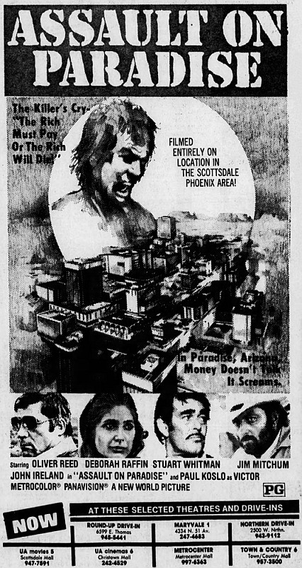 Produit en grande partie par la New World Pictures de Corman, Assault on Paradise ne commence pas si mal, c'est-à-dire de façon mystérieuse, par une série inexpliquée de meurtres : un préambule où un couple est abattu à bout portant dans sa voiture, un flic qui se prend une flèche en plein cœur grâce à un tir à l'arc bien ajusté, notre Indien qui ajuste une joueuse de tennis sur un court avant d'arriver à décaniller avec une fronde le vieux monsieur présent lui aussi, probablement un pervers pépère fortuné amateur de jeunettes et qui vient vers le corps de la jeune victime. Et puis les explications sont données, le peau-rouge se met à pérorer en voix-off qu'il est le vent venant balayer l'Amérique de sa crasse richesse acquise aux dépends des minorités et, à partir de là, au lieu de prendre son envol, telles des plumes d'aigle récompensant des morceaux de bravoure, le film abat une après l'autre ses cartes pour se figer dans un no man's land assez pitoyable.