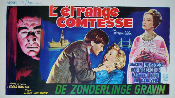 Que dire de ce Krimi, qui termine une année 1961 particulièrement prolifique pour ce genre, et qui fait partie de la fournée de quatre films (dans l'ordre chronologique : Le Narcisse jaune intrigue Scotland Yard, Le Faussaire de Londres, le présent métrage et L'orchidée rouge), situés entre les trois chefs-d’œuvre du genre (Les mystères de Londres, La porte aux sept serrures et Le requin harponne Scotland Yard, soit les trois premiers Edgar-Wallace-Filme signés Alfred Vohrer, ce qui n'est bien entendu pas un hasard) ? Une fournée qui ne constitue pas un bloc homogène mais dont tous les films (dont les points forts et les défauts sont souvent différents) se situent qualitativement dans une honnête moyenne. On peut donc qualifier cette Etrange comtesse de sympathique mais pas inoubliable, avec d'un côté une réalisation assez terne au service d'une histoire assez quelconque (tirée comme il se doit d'un roman d'Edgar Wallace) et de l'autre côté une interprétation digne d'éloges et les débuts en fanfare (ah-ah) de Peter Thomas à la B. O.