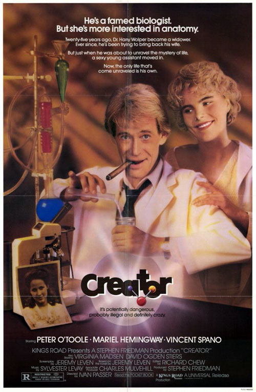 Creator n'a jamais trouvé son public et on peut le comprendre aisément puisqu'il aborde un thème très original (la création de l'amour d'une manière scientifique) sur un mode en demi-teinte, celui de la comédie dramatique. Donc, puisqu'il s'agit d'un équivalent de la création de Dieu grâce à la Chimie et, plus largement, à la science, inutile d'aller y chercher des dérapages incontrôlés du style Une créature de rêve sorti la même année, vous trouverez à la place de la philosophie, de l'existentialisme, du romantisme ou tout du moins une quête du romantisme comme équivalent de l'amour physique, mais aussi et tout de même, pour ceux qui ces mots seraient dissuasifs, de la malice ainsi que pas mal de mots crus en guise d'humour ("j'en ai marre de jouir pour que dalle. Dès que je suis en présence d'un beau gosse, je mouille à l'idée de le voir et rien qu'en passant la porte de chez lui j'ai un orgasme", phrase distillée ici par la jeune Mariel Hemingway (qui fait preuve de beaucoup d'abattage) et qui accepte donc de jouer les cobayes pour ce vieux scientifique qui du joue les gynécologues et a "bien de la chance d'accéder à sa chatte".