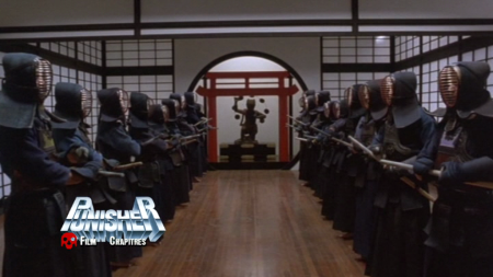 - (67e) Dans le complexe de Lady Tanaka – La première offensive du Punisher accompagné de Franco, qui mitraillent une garde composée de samouraïs. Une coupe a été effectuée sur les corps vacillants de samouraïs, criblés de balles :