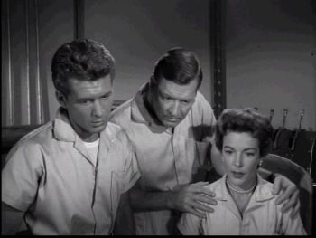 Voilà en résumé de quoi il retourne dans « La Martienne diabolique » (personnellement, j’aurais traduit le film par « La Martienne est une grosse salope », mais peut-être aurait-ce été moins vendeur). L’œuvre se résume à un huis-clos dans la dite auberge et ses proches alentours, avec des aller et retour incessants de Nyah depuis sa soucoupe jusqu’à l’établissement. Les scènes où on ne la voit pas sont clairement les moins intéressantes, puisqu’elles se focalisent alors sur divers psychodrames pas franchement passionnants, comme les états d’âme du fugitif, ses doutes quant à son avenir et sa relation avec Doris ; puis la passion qui naît entre le reporter et le mannequin ; et enfin la fugue du gosse qui inquiète tata et tonton Jamieson (à mon grand regret, le moutard ne sera pas désintégré ; mais fort heureusement on le voit peu dans le film).
