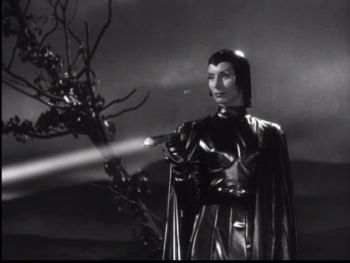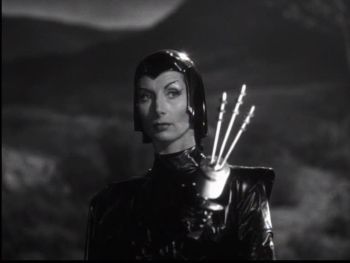 Le cinéma de science-fiction, au lendemain de la seconde guerre mondiale, fut dans l’ensemble le domaine de prédilection des Américains. Dans l’ensemble… mais pas uniquement. En pleine période de guerre froide entre les Etats-Unis et l’URSS, on trouve quelques exemples de films abordant la menace rouge (symbolisée par les Martiens) en provenance du Royaume-Uni. C’est le cas de ce « Devil Girl from Mars », réalisé par l’Ecossais David MacDonald, largement moins connu que ses homonymes Richard et Maurice, pionniers de la restauration rapide et responsables involontaires de la malbouffe dans la civilisation industrielle. David, lui, n’est pas porté sur la nourriture, mais sur les Martiennes tendance fétichiste. Vêtue de cuir noir de la tête au pied, Nyah ressemble en effet à une maîtresse SM adepte du bondage. Ce look n’est peut être pas anodin, finalement, puisque notre Martienne est venue sur Terre afin d’asservir les hommes.