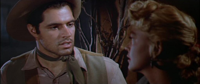 Chouette western que celui-là, court, dense, et à l’atmosphère de huis-clos explosif où l’on sent que les armes ne sont jamais très loin de parler à la place de ceux qui les ont en mains. Petit budget très bien négocié par son réalisateur, Harry Keller (également auteur d’un autre western réussi : Les 7 chemins du couchant), qui pousse ses personnages les uns contre les autres, parfois tout contre d’ailleurs, lorsqu’il s’agit de Chaney. Promise à une mort lente dans une ville abandonnée, celle-ci cherche son salut dans chacun des autres membres de la bande, aucun n’étant insensible à ses charmes d’autant plus puissants qu’elle est la seule femme alentour. L’arrivée surprenante d’un ménestrel quincailler au milieu de la nuit offre à tous un répit poétique et permet au spectateur d’en apprendre un peu plus sur Gantry, l’alter ego positif d’Heller, le desperado raisonnable qui cultive une sagesse qu’on imagine acquise au fil du temps.