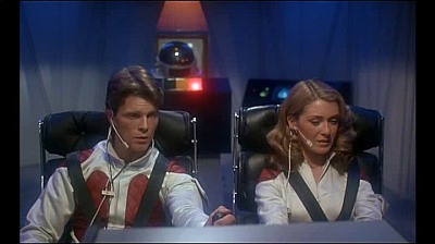 Non, "Alerte dans le cosmos" est un spectacle avant tout fantaisiste et bon enfant, sans profondeur aucune et avec comme seule ambition celle de distraire l'enfant qui sommeille en nous. Certes, ces intentions minimales sont entachées de deux/trois passages plus que farfelus, suscitant effectivement le sourire ou le rire. Il y a par exemple une scène irrésistible de par sa maladresse : celle illustrant nos deux jeunes aspirants New Wave traversant un champ magnétique puissant, avec notre jeune Nicholas Campbell qui tente de rejoindre, dans une foulée au déhanchement singulier défiant au ralenti toute gravitation sensée et insensée, sa compagne de bord.