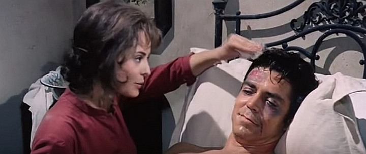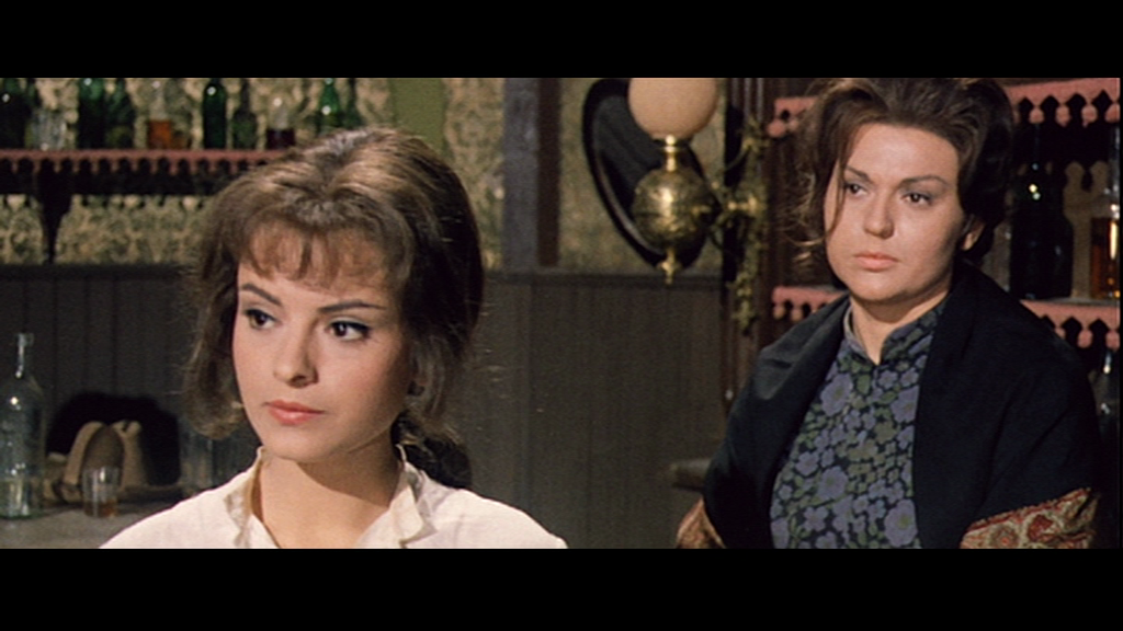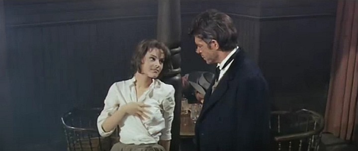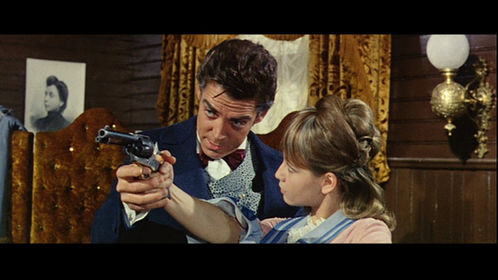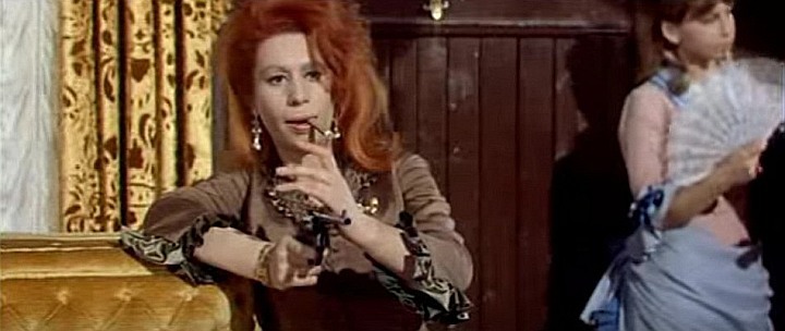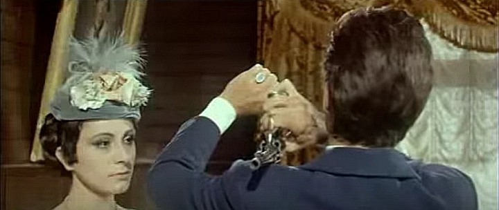 Quoi qu'il en soit, alors que la multiplicité de scénaristes aurait pu faire craindre le pire, "Sugar Colt" se maintient bien tout en pratiquant le mélange des genres. Passé le préambule, l'action se fait légère tout d'abord, avec cette agence de détectives qui pullule de femmes tireuses d'élite, ensuite avec l'arrivée dans la petite bourgade de Snake Valley du Dr. Tom Cooper : les visages des habitants se figent, inquiets de la venue d'un étranger, perçue semble-t-il comme une intrusion signe de graves ennuis à venir (et ils n'ont pas tort !). Après s'être fait passer à tabac en guise de bizutage, on tombe dans le burlesque lors d'une scène où Doc Cooper glisse des herbes hallucinogènes dans le poêle chauffant le salon, sorte de gaz hilarant qui ne manque pas de se faire plier en quatre les plus patibulaires des bandits. Certains se fendent de vannes vaseuses en pleines parties de poker tandis que d'autres se mettent à marcher à quatre pattes sous les tables. Seule Bess (Gina Rovere), la tenancière, bien que méfiante, accepte du médecin l'antidote. Quant à sa jeune nièce, Josepha (Soledad Miranda), trop sceptique, elle fait semblant d'accepter pour recracher ce qui lui aurait éviter de tomber dans les bras du sieur Cooper (ce qui vaut à Josepha un bon bourre-pif façon cow-boy de la part de sa tante, à qui on ne la fait pas). Mais au fil des scènes, les choses se corsent, Cooper défie d'abord certains cow-boys à la boxe anglaise puis, acculé, dévoile sa vraie identité : "Ok, le docteur Cooper est parti mais, à la place, Sugar Colt est là !".
