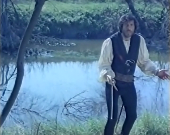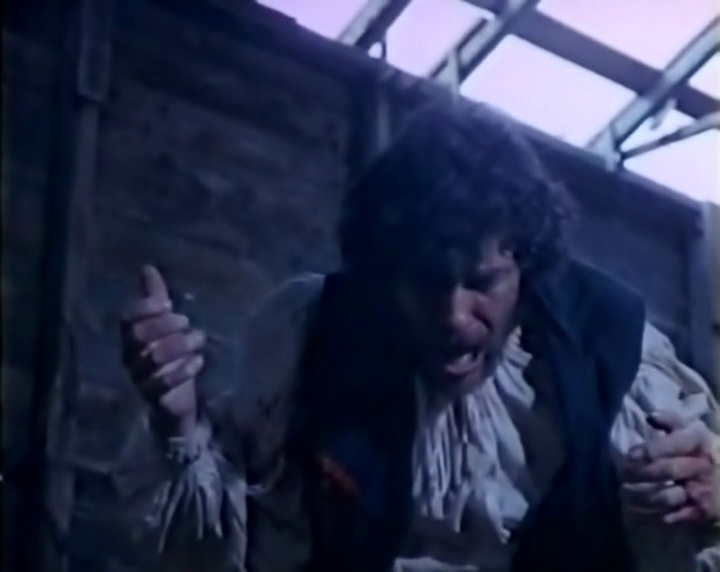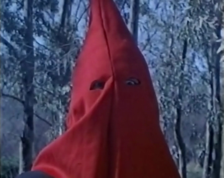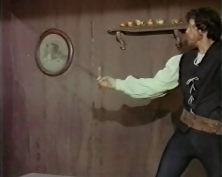 Pour le reste, c'est menu rassi au choix : un serviteur (John Benedy/Patrick vive ancora) ouvrant la porte à trois bombasses en leur réservant un accueil de merde puis en gardant ensuite une tronche renfrognée ; deux actrices blondes qui se mangent goulument la bouche dans une scène saphique où l'on ne distingue très vite plus qui est qui (en même temps, on s'en fiche un peu) ; des apparitions et disparitions d'un spectre de la mort encagoulé de rouge qui font sauter la bobine par leurs mauvais raccords (des hommages probables au temps du cinéma muet) ; un Edmund Purdom empâté ne se pointant qu'en milieu de bobine, quand ne l'attend plus, et faisant office de Dom Juan du Mal et de tentateur et révélateur (de la chair triste et du plaisir terni, pourrait-on ajouter) ; un Robert Wood séducteur lui aussi, plus naïf et plus manipulable et qui semble être sorti d'un film de pirate, ce dernier ne lâchant quasiment jamais son épée ; le même Robert Wood qui finit par tuer son double en lui fracassant le crâne dans un délire digne de Eros et Thanatos (seule scène sanglante film, soit-dit en passant, et pour ne pas se tromper sur la marchandise) ; des femmes vampires, surgies de nulle part et surtout d'un autre film elles aussi (on pense cependant à ce moment à ce que fera plus tard Jean Rollin, lui aussi inspiré par le théâtre Grand Guignol) ; enfin, la virginité perdue par la grâce du démon et vue à travers le feu de l'Enfer (quelques bûches enflammées dans une cheminée).