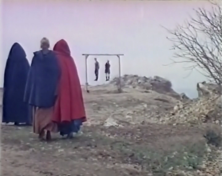 Noyées dans une photographie brumeuse, comme émanant d'un pet de poney, émergent contre toute attente deux ou trois scènes étonnantes par leur beauté graphique : ainsi lorsque Helga, suivant les conseils de la sorcière, arrive en haut d'une colline en compagnie de deux jeunes vierges afin de conjurer le sort jeté sur sa robe nuptiale, les trois femmes croisent deux pendus, l'ensemble offrant une sorte de tableau somptueux dans lequel la défloraison à venir s'annoncerait funeste. On ne sait pas si les deux hommes se balançant au bout de la potence ont eu, en guise de dernier moment, une érection ; ce qui est certain en revanche, c'est que malgré malgré ce genre d'éclairs fugaces, et malgré quelques scènes de détroussage de croupes, L'Amante del demonio offre un spectacle tout sauf bandant, plus proche de la purge médiévale que de la Renaissance priapique.