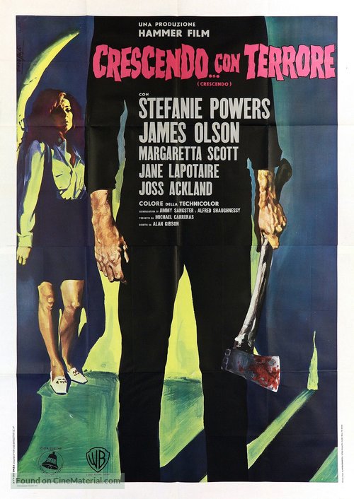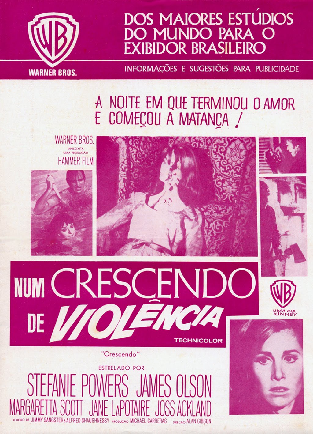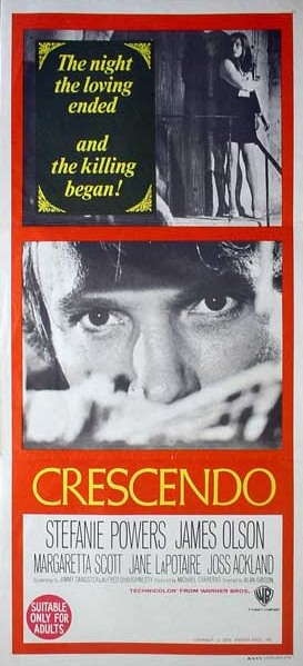 Crescendo est donc produit par Michael Carreras (Maniac, Le Peuple des abîmes, La Momie Sanglante, "Les femmes préhistoriques",...) et tourné, pour ses quelques extérieurs, dans le Sud de la France, à l'instar des "Gialli Riviera". L'une de ses principales caractéristiques, laquelle est loin d'être inédite au sein de la firme, est de ne mettre en scène aucune star, aucun nom sur lequel il peut capitaliser. Soit, Stefanie Powers fut déjà l'héroïne de "Fanatic" (1965) et, niveau thriller, elle a également fait ses preuves dans Warning Shot de Buzz Kulik ; si la bête est plutôt gironde, on ne peut affirmer cependant qu'elle possède un fort magnétisme ou un pouvoir de séduction puissant et irrésistible. James Olson vient juste de faire ses preuves dans un premier rôle sous la houlette de Roy Ward Baker dans "Alerte satellite 02" ; il était cantonné jusque là, soit dans les rôles très secondaires autour desquels l'intrigue ne s'articulait jamais, soit dans des bobines intimistes issues d'un cinéma beaucoup plus indépendant ("Rachel, Rachel" de Paul Newman) ; un acteur à la carrière assez étrange, toute en dents de scie ; Olson retournera tourner uniquement dans moult séries télévisées avant de revenir au début des années 80, en tête d'affiche de Amityville II: le possédé en plus d'apparaître, par exemple, dans "Commando" de Mark L. Lester. Margaretta Scott, dans le rôle de maman Olson, semble ressortie du placard par les producteurs, telle une momie ; après quelques seconds rôles dans les années 30 et 40, elle était jusque là confinée à la seule télévision. Joss Ackland en domestique, bien qu'aperçu dans "Raspoutine, le moine fou", n'est pas encore un visage très familier, de ceux qu'on connait sans pouvoir forcément mettre un nom dessus. Concernant Jane Lapotaire, en servante et infirmière, c'est plus simple encore, Crescendo n'est que son second rôle, dont le tout premier pour le grand écran.