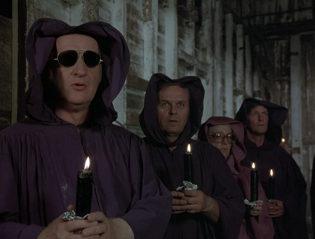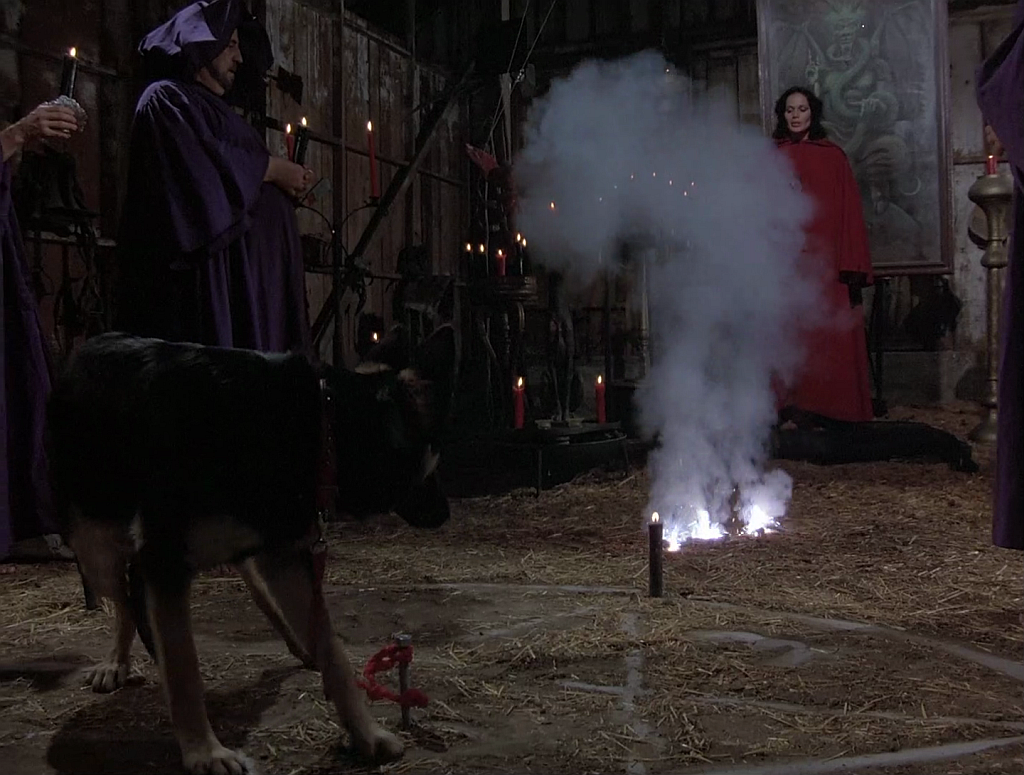 Satan fut jadis actionnaire des productions de la Hammer, voire de la Amicus. Ici,, Devil Dog débute par une cérémonie mettant en scène Martine Beswick initiant une pauvre chienne sauvée de la SPA pour se retrouver dans un pentacle. L'un de ses chiots est donné par ce bon R.G. Armstrong, acteur régulièrement au service de Satan... Du reste, celui-ci, peu après Race with the Devil vient de croiser l'incarnation du Diable lui-même, en voiture tueuse, dans Enfer mécanique (The Car, 1977). Pas de bol, décidément !