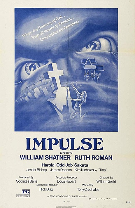 Par ses aspects grand-Guignol flirtant avec le grotesque, Secret Pulsion n'est pas sans évoquer les travaux à venir d'un certain Brian de Palma. On pense à "Pulsion" en premier lieu, voire à "L'esprit de Caïn" et, à ce sujet encore, William Shatner peut même apparaître comme le grand-frère de Michael Caine et de John Lithgow. William Grefé bénéficie d'un étrange avantage sur le brillant cinéaste stylistique, ainsi que sur nombre de ses confrères : certes, il paye son tribu au cinéaste-modèle mais il ne joue jamais le rôle d'écolier studieux ou de copiste consciencieux sous influence hypnotique jouant dans l'immense cour cinématographique Hitchcockienne. Si tant est qu'on veuille apprécier la chose, c'est ainsi qu'il convient de voir Impulse pour l'apprécier. Shatner livre d'ailleurs une prestation bien plus dantesque que la triste réputation qu'on lui prête. Certes, quelques unes de ses crises pourvues d'insultes machistes prêtent à sourire, mais il s'agit ni plus ni moins d'une complicité malicieuse de spectateur placé devant une folie se manifestant en public, regardant un malade confronté à des faits tout à fait banals, créant du coup un violent décalage entre une folie incontrôlée et la normalité, en rien les traits d'un second degré se prêtant à la moquerie d'une composition soit-disant ridicule.